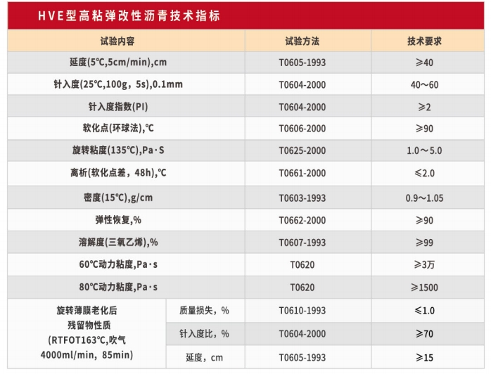 HVE型高粘彈改性瀝青是在SBS改性瀝青基礎(chǔ)上,加入特制的高粘彈改性劑,經(jīng)高溫熔融、剪切、發(fā)育形成的高性能改性瀝青。區(qū)別于普通SBS 改性瀝青, HVE 高粘彈改性瀝青粘度高、彈性恢復(fù)能力好,制備的改性瀝青混合料抗車(chē)轍性能、抗水損害性能以及抗飛散性能優(yōu)異,能夠大幅度增加瀝青路面服役年限。